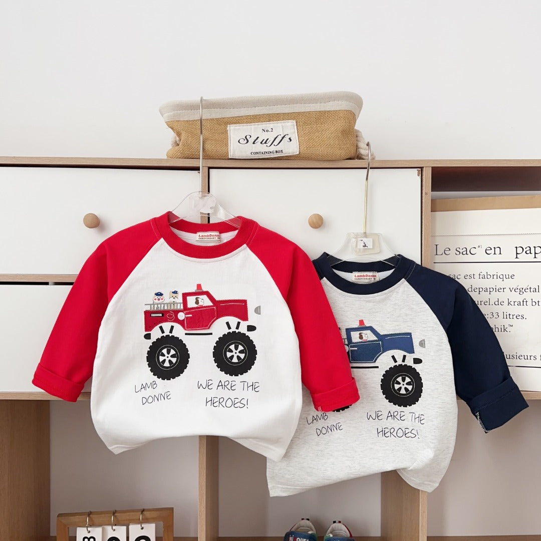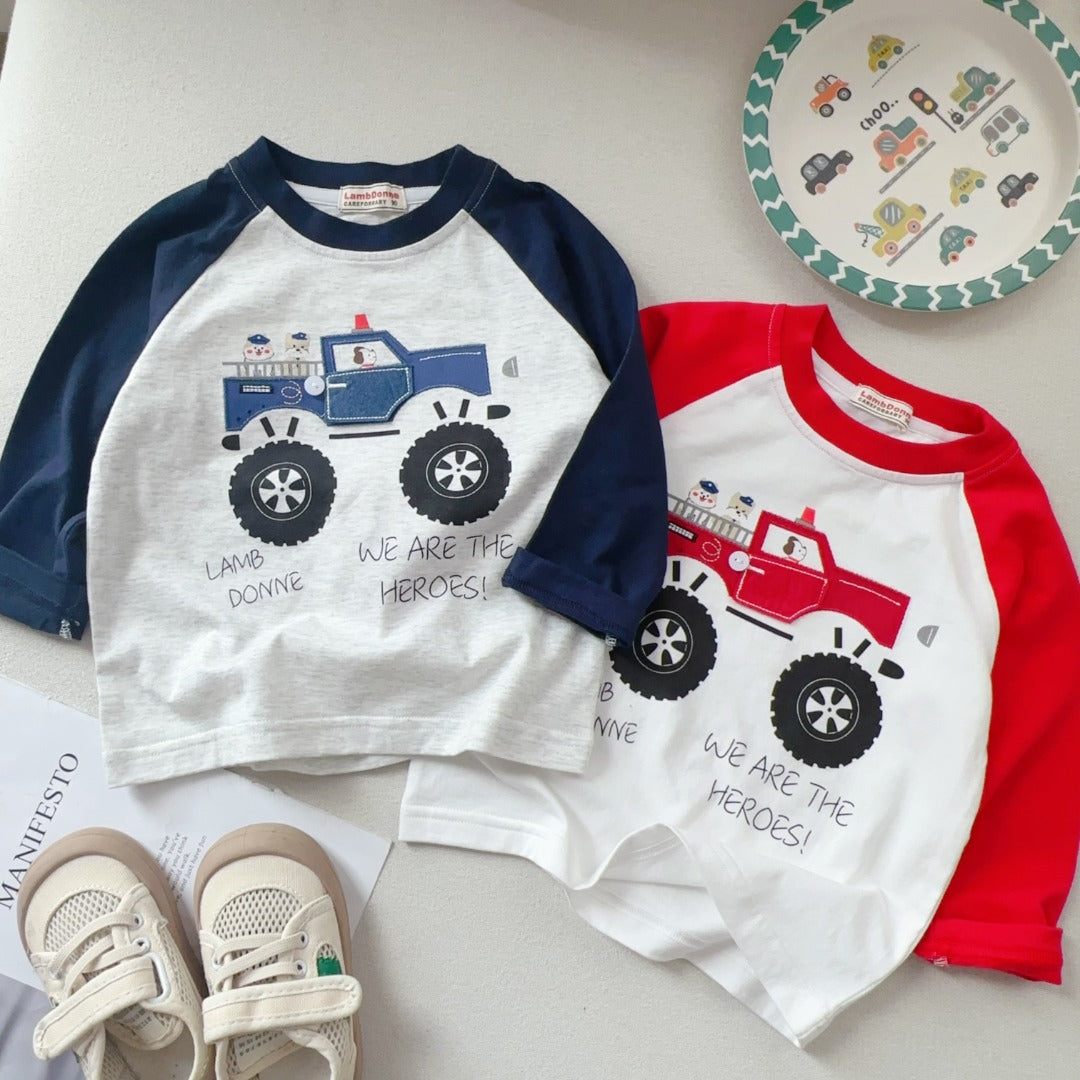 The LambDonne Hero Truck Raglan Tee features an eye-catching monster truck graphic driven by adorable hero characters. With bold color-block raglan sleeves and a dynamic βWE ARE THE HEROES!β print, this top sparks adventure and confidence in every little explorer. βπ§